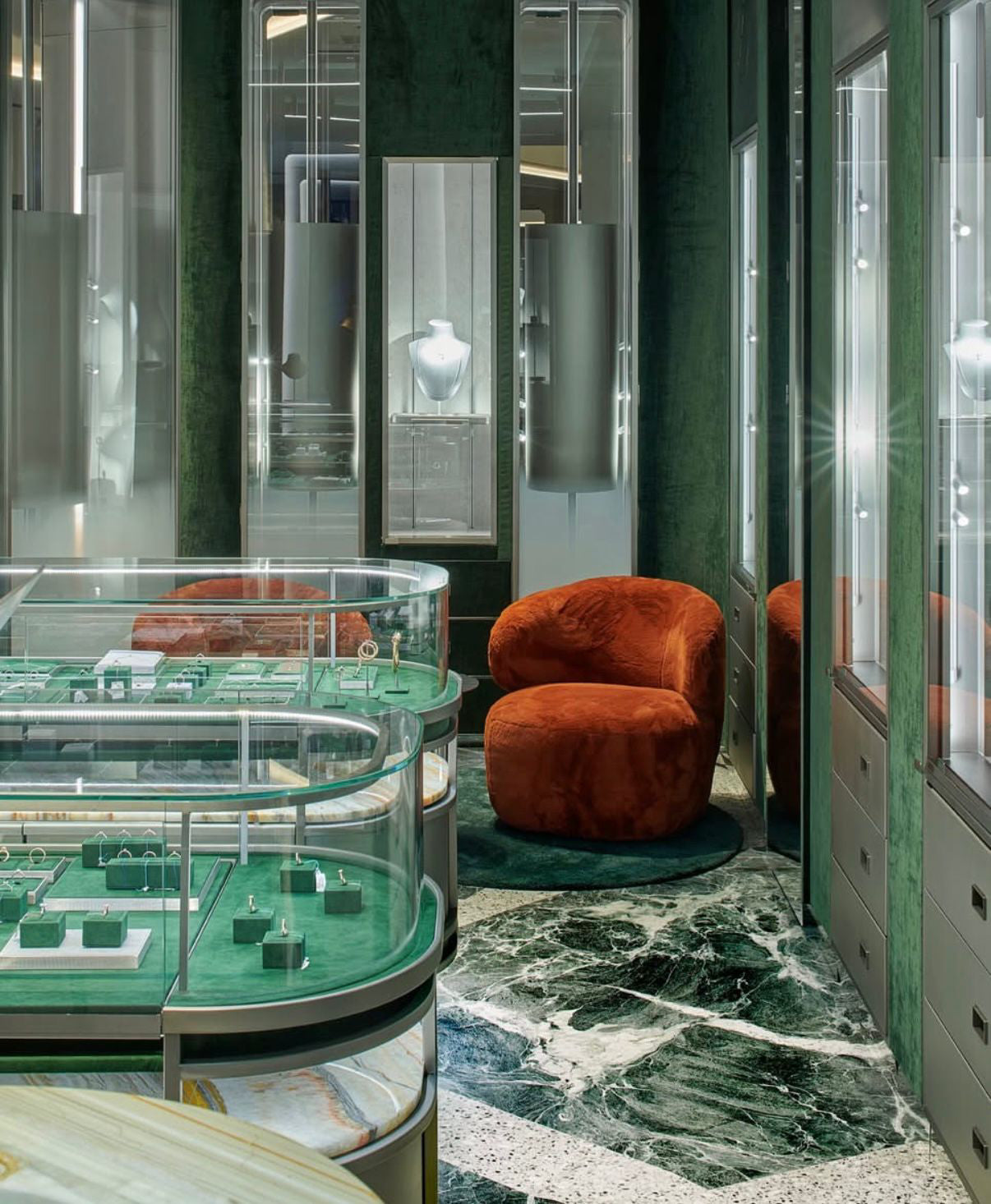Apvalūs oranžiniai foteliai simbolizuoja komfortą ir saugumą. Jų forma atspindi tą pačią filosofiją kaip ir mūsų vitrinos – nieko aštraus, nieko agresyvaus, tik švelnus, elegantiškas svetingumas.
